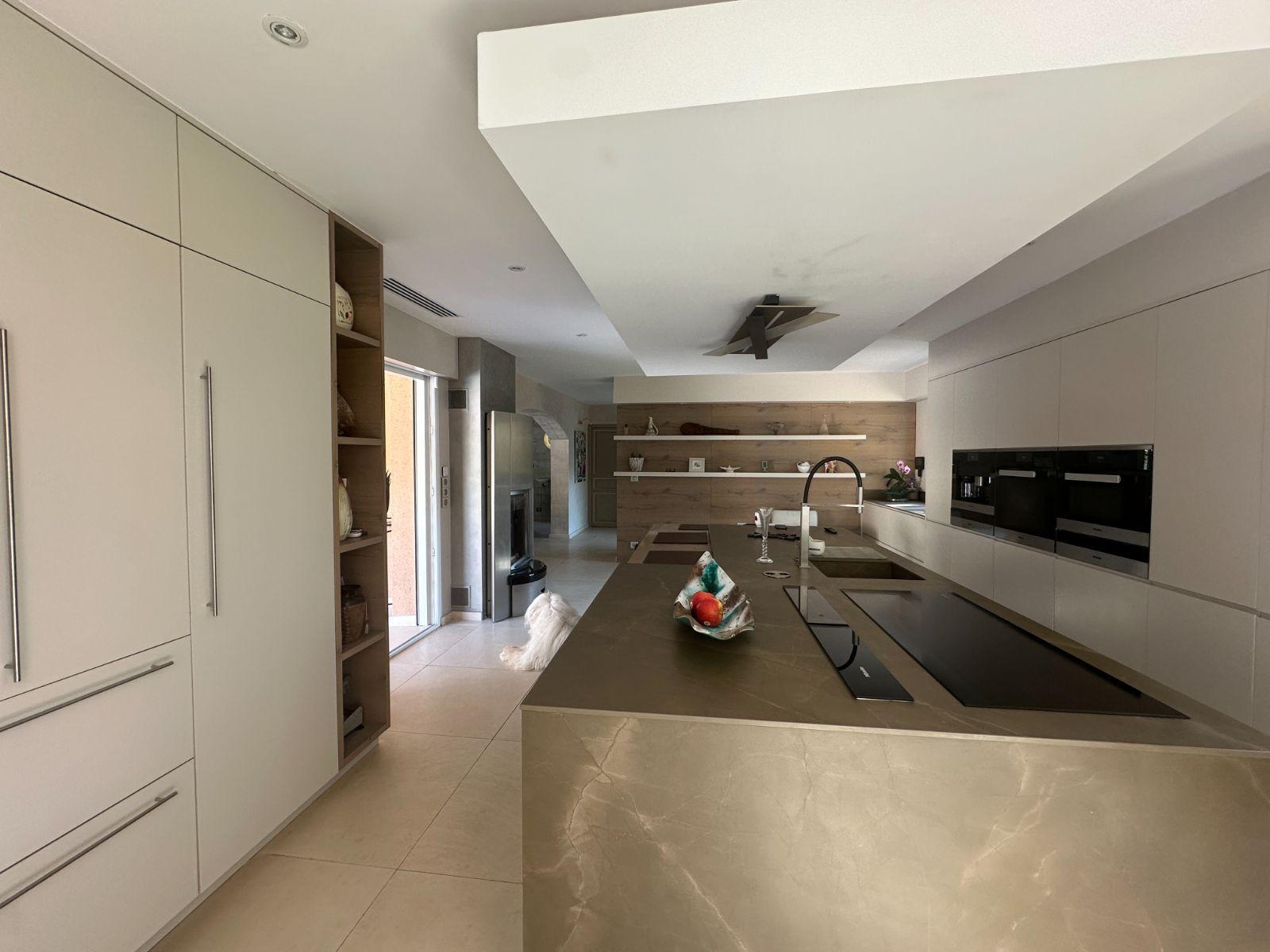 L’extérieur est à l’image de l’intérieur, avec une très belle piscine à débordement, ses plages avec SPA, une cuisine d’été, et plusieurs espaces aménagés pour profiter confortablement du jardin paysager et de sa dizaine d’oliviers.